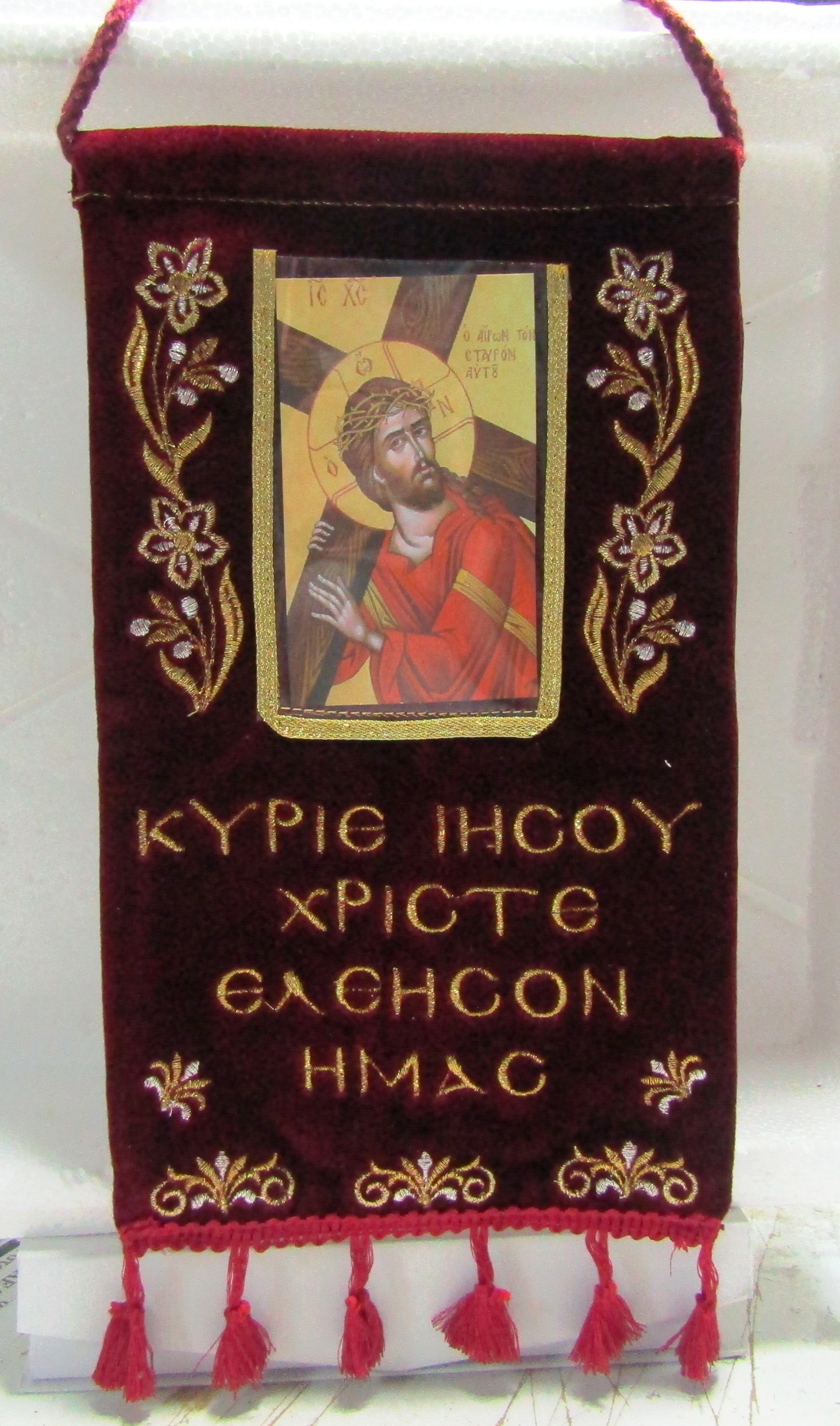 Χρυσοκέντητο σε βελούδο με την ευχή και εικόνα τον