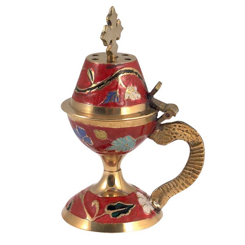 Μικρό μπρούτζινο οικιακό θυμιατό με επίστρωση σμάλτου σε κόκκινο χρώμα.